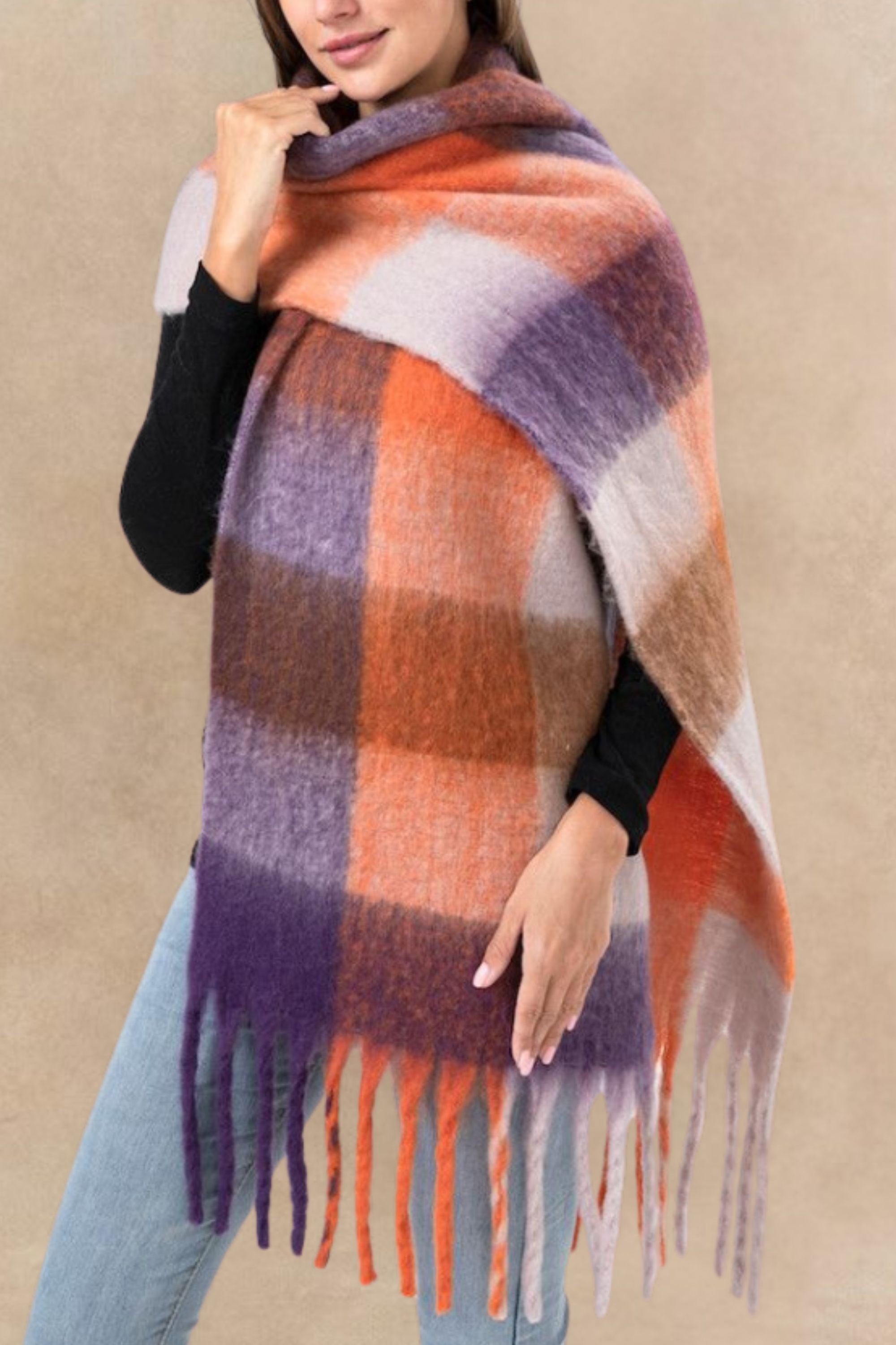 Cozy plaid scarf with some colors checks. Soft, warm, and lightweight with long fringed edges — perfect to layer over coats or sweaters for a chic autumn look.