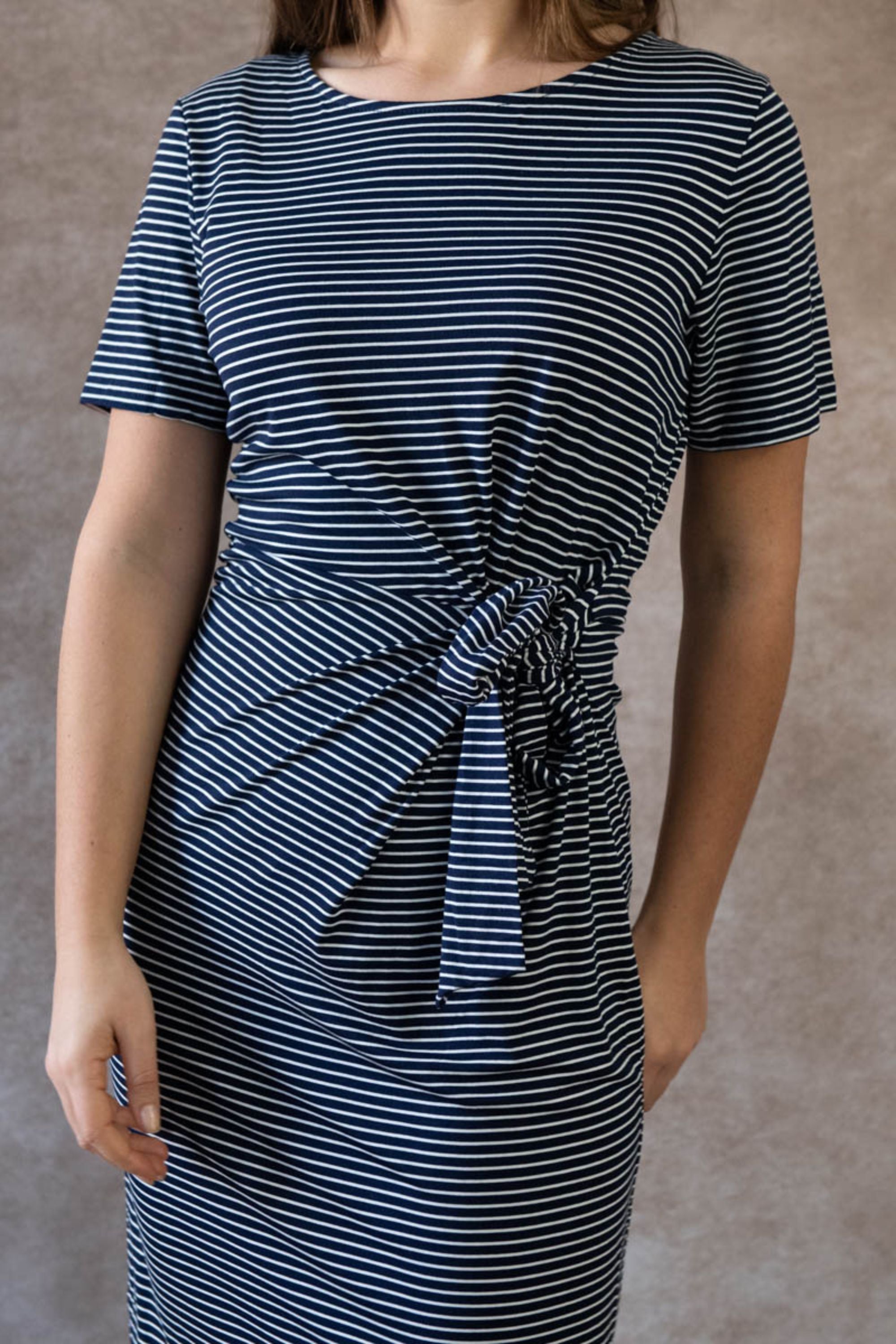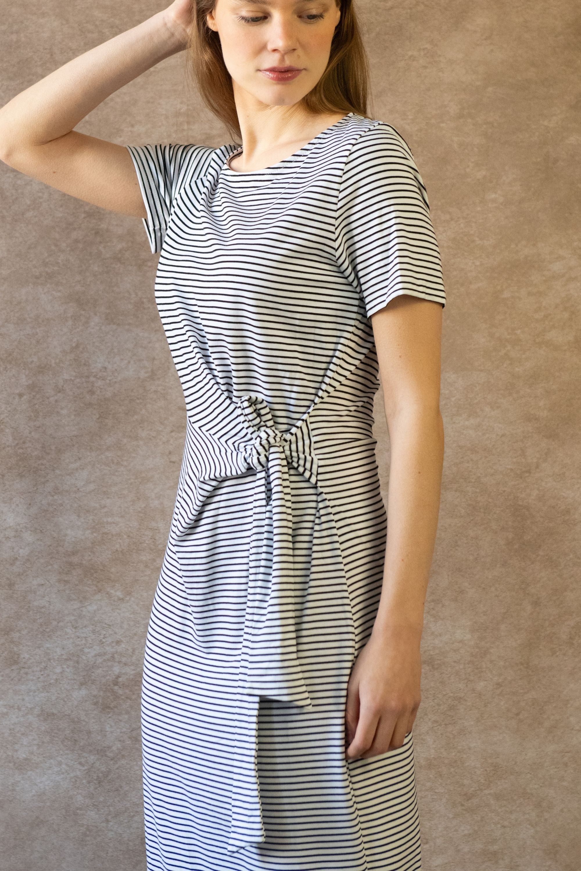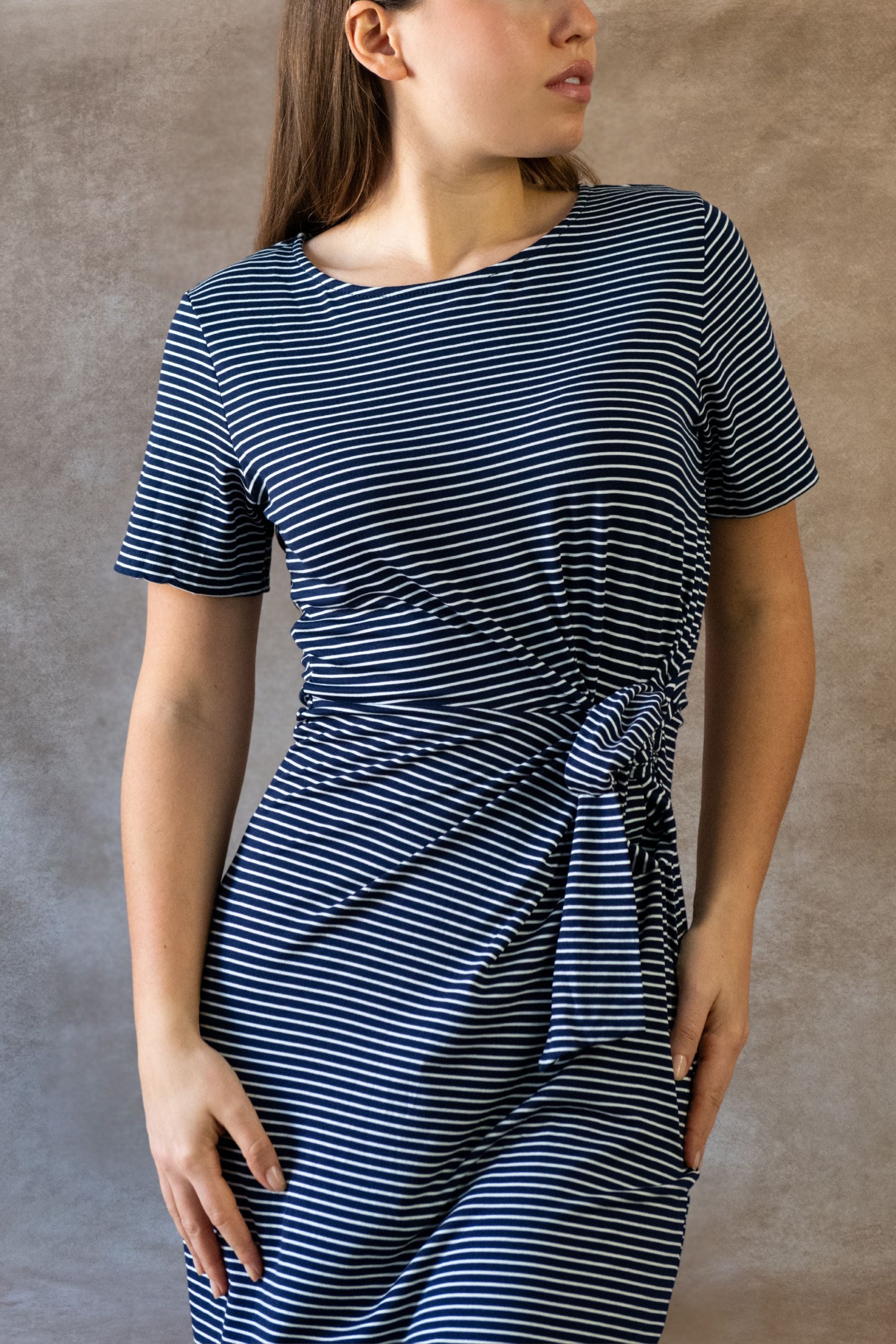 The Brianna Midi Dress is the perfect blend of modern elegance and everyday comfort. Designed with a classic striped knit motif in chic black or navy, this midi-length dress offers a figure-flattering silhouette. The soft stretch fabric and cinched waist with a tie detail create a tailored fit that enhances your curves. Featuring a sophisticated boat neckline, short sleeves, and a stylish side slit, this dress effortlessly transitions from workwear to weekend outings.