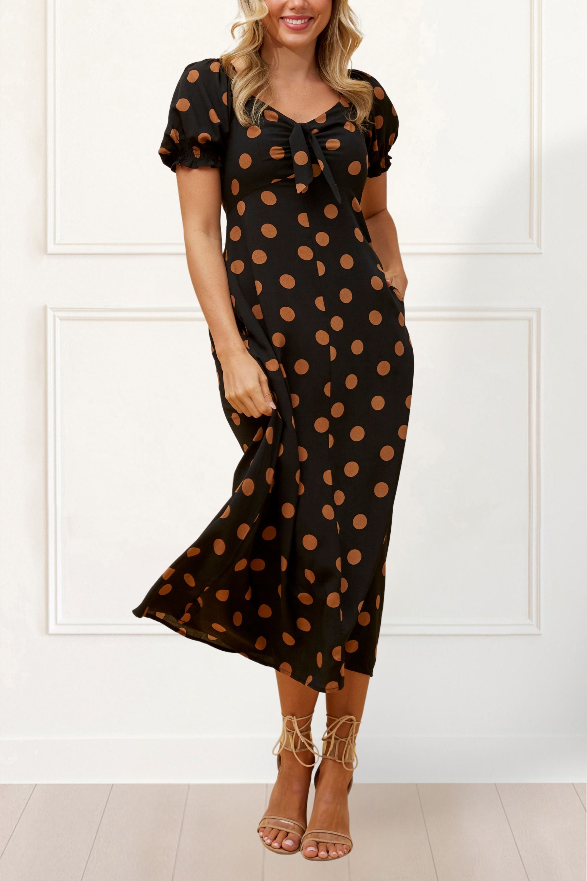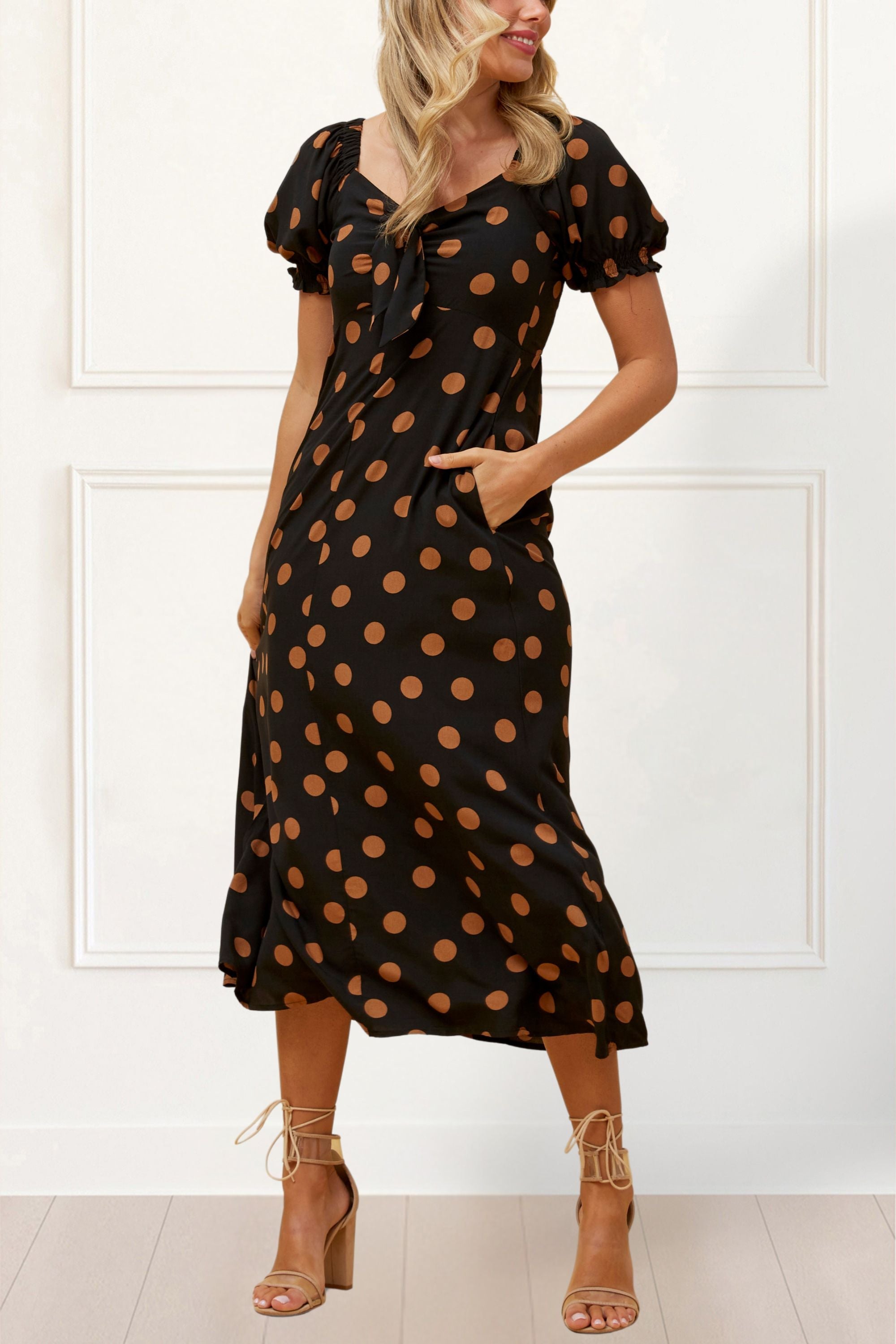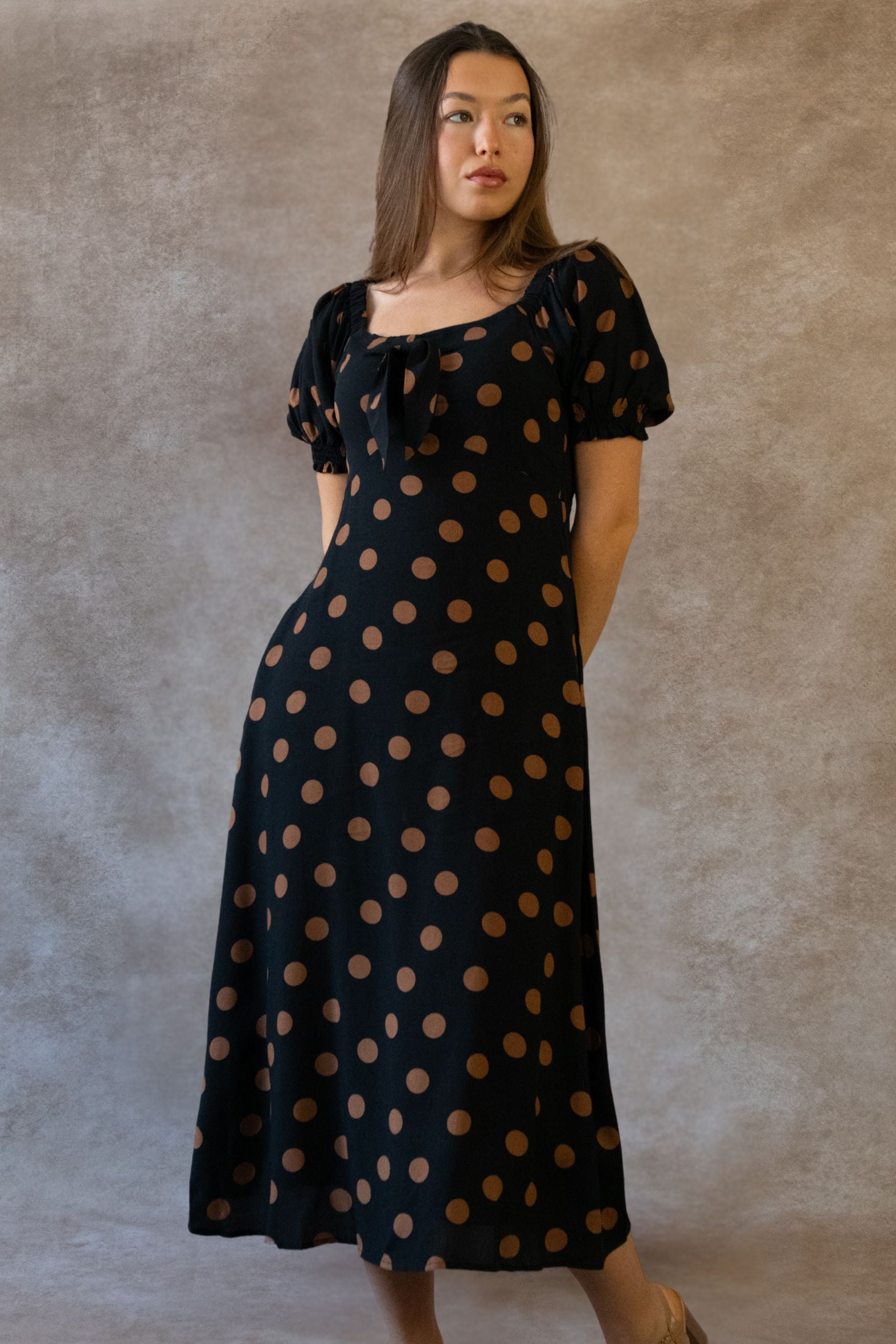 The Charlotte dress is a timeless statement piece featuring a playful black and rust polka dot print. Designed with a charming sweetheart neckline and an elegant tie-front detail, this dress radiates vintage-inspired sophistication. The puff sleeves add a touch of femininity, while the flowing A-line silhouette provides ease of movement. Functional side pockets bring a practical yet stylish addition to this delightful piece.