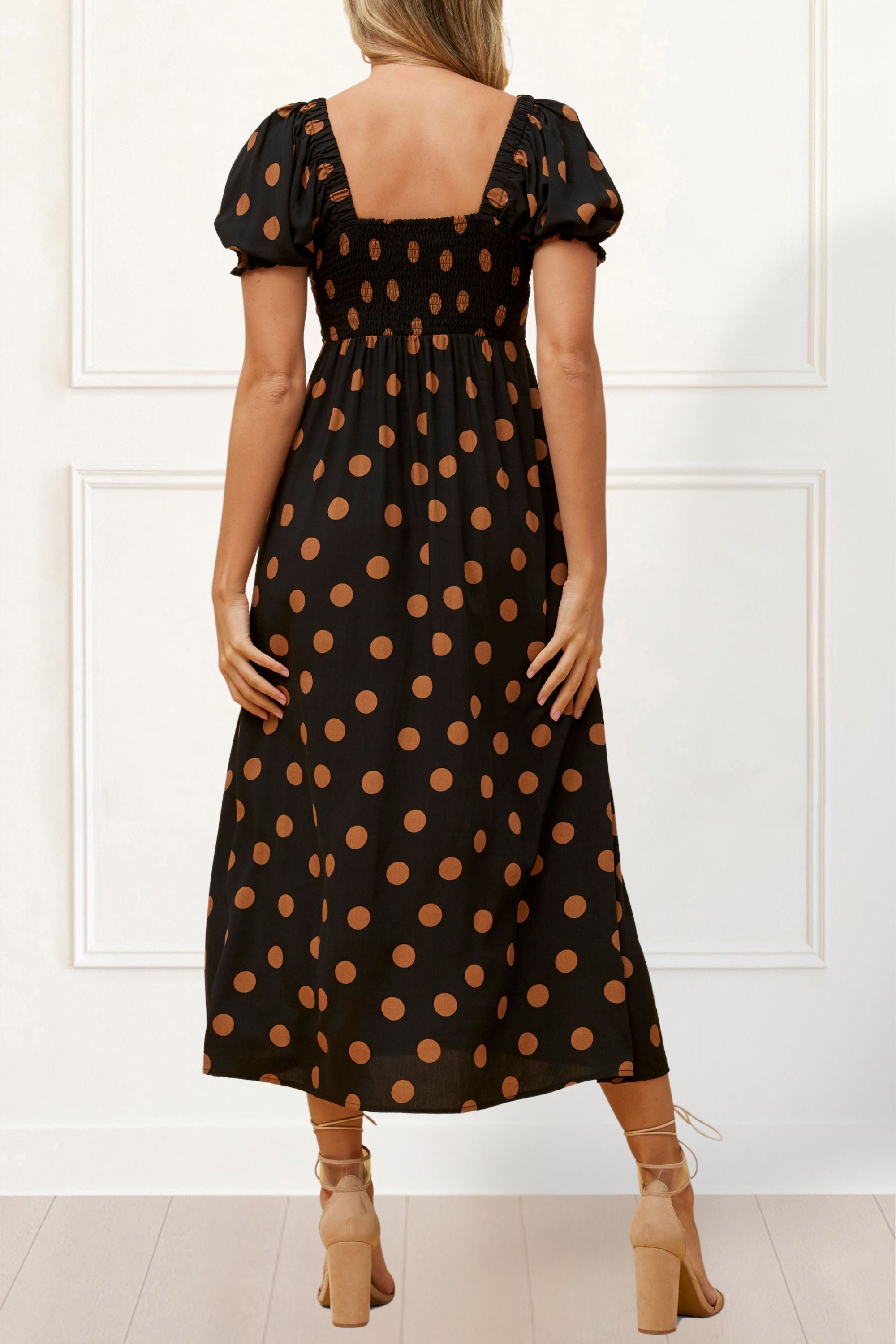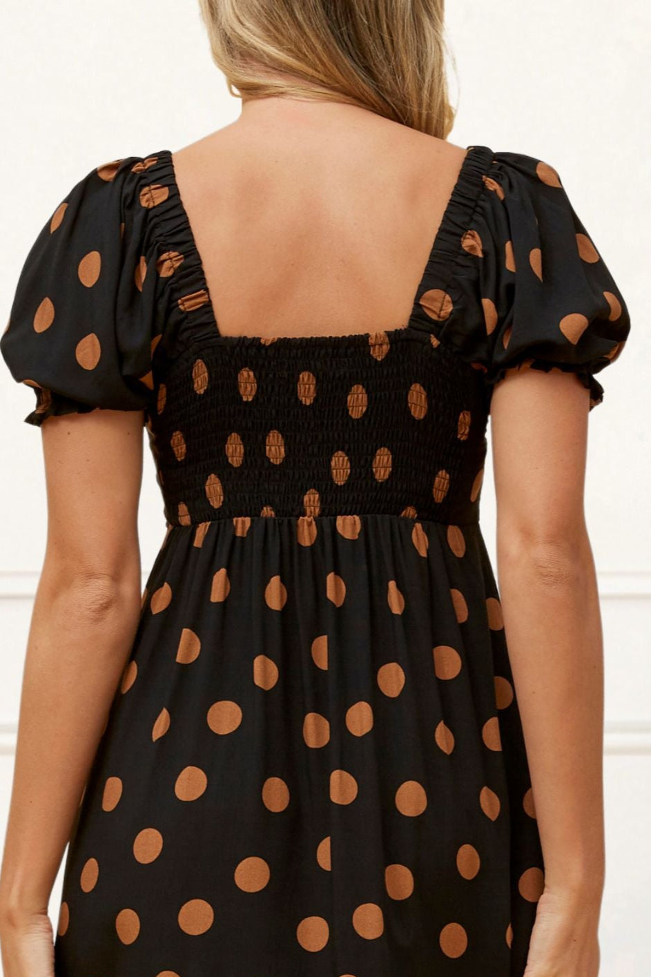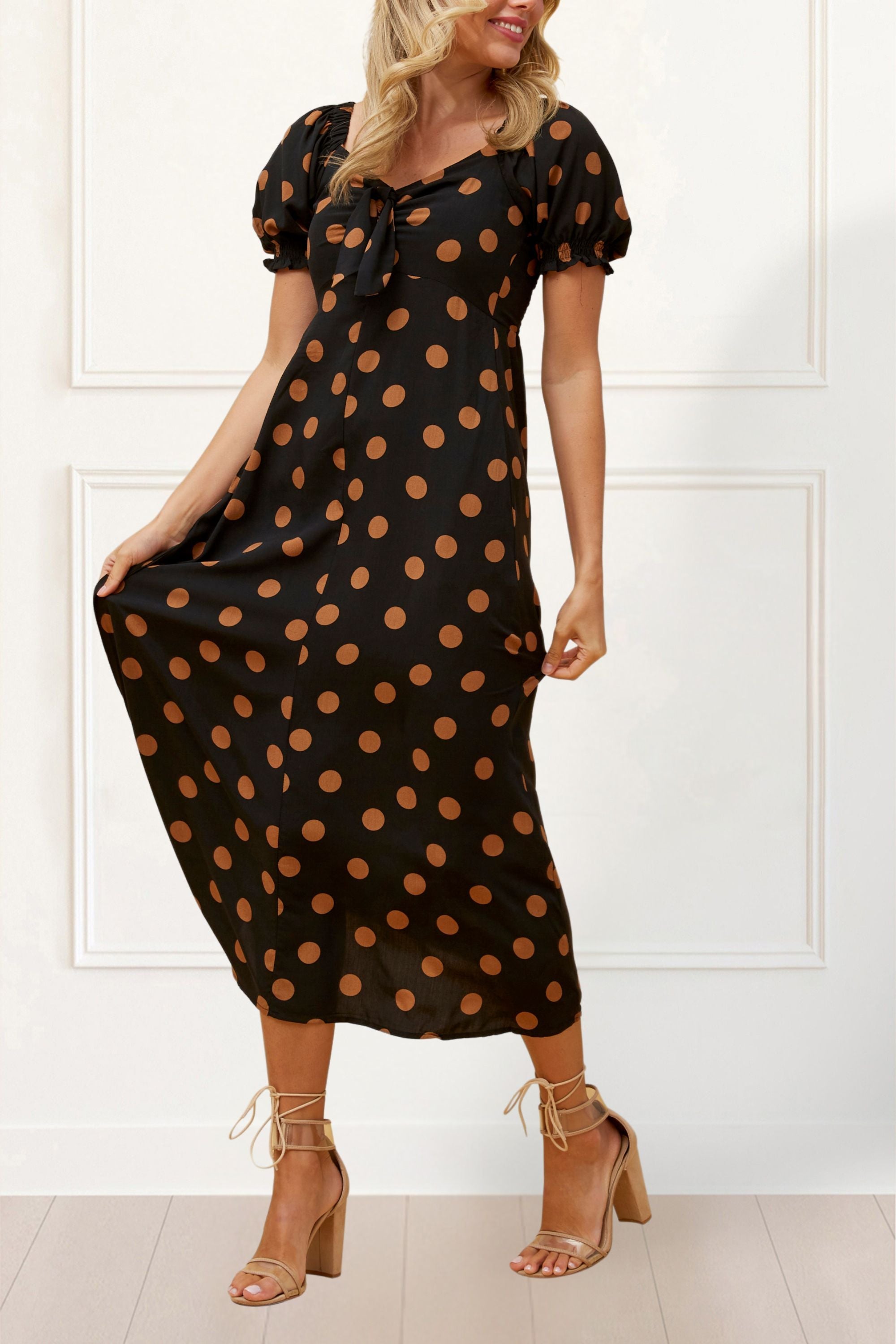 The Charlotte dress is a timeless statement piece featuring a playful black and rust polka dot print. Designed with a charming sweetheart neckline and an elegant tie-front detail, this dress radiates vintage-inspired sophistication. The puff sleeves add a touch of femininity, while the flowing A-line silhouette provides ease of movement. Functional side pockets bring a practical yet stylish addition to this delightful piece.