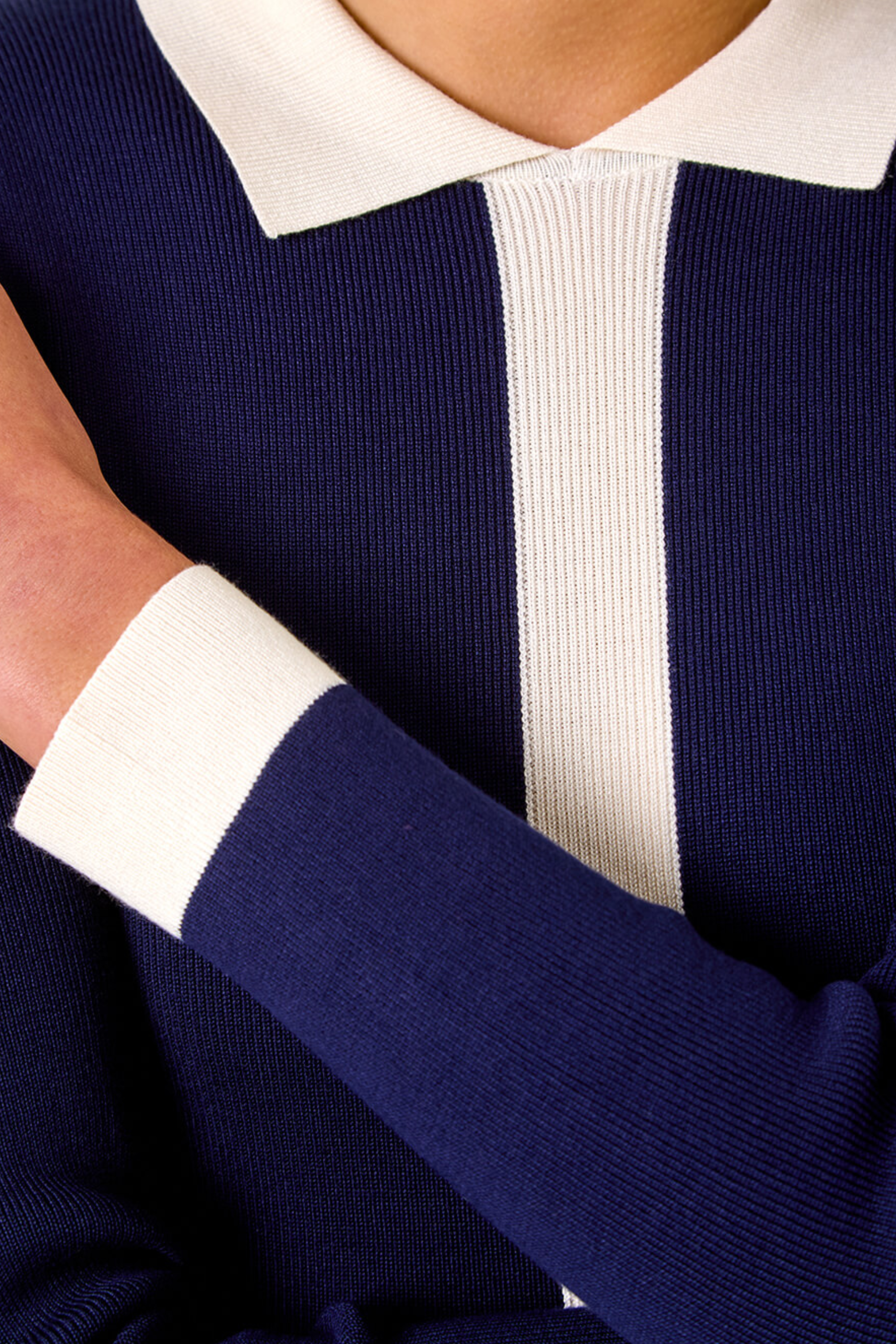 The Clarissa dress blends timeless elegance with subtle vintage flair in a flattering fit-and-flare silhouette. Designed with a soft, structured knit, this dress features bold contrast trim that highlights the waist, collar, and cuffs, creating a refined yet playful look. The pleated skirt adds graceful movement, while the long sleeves offer all-season versatility. Available in two striking colorways—classic black with warm rust and deep navy with crisp ivory—Clarissa is a polished choice for workdays, gatherings, or city strolls.