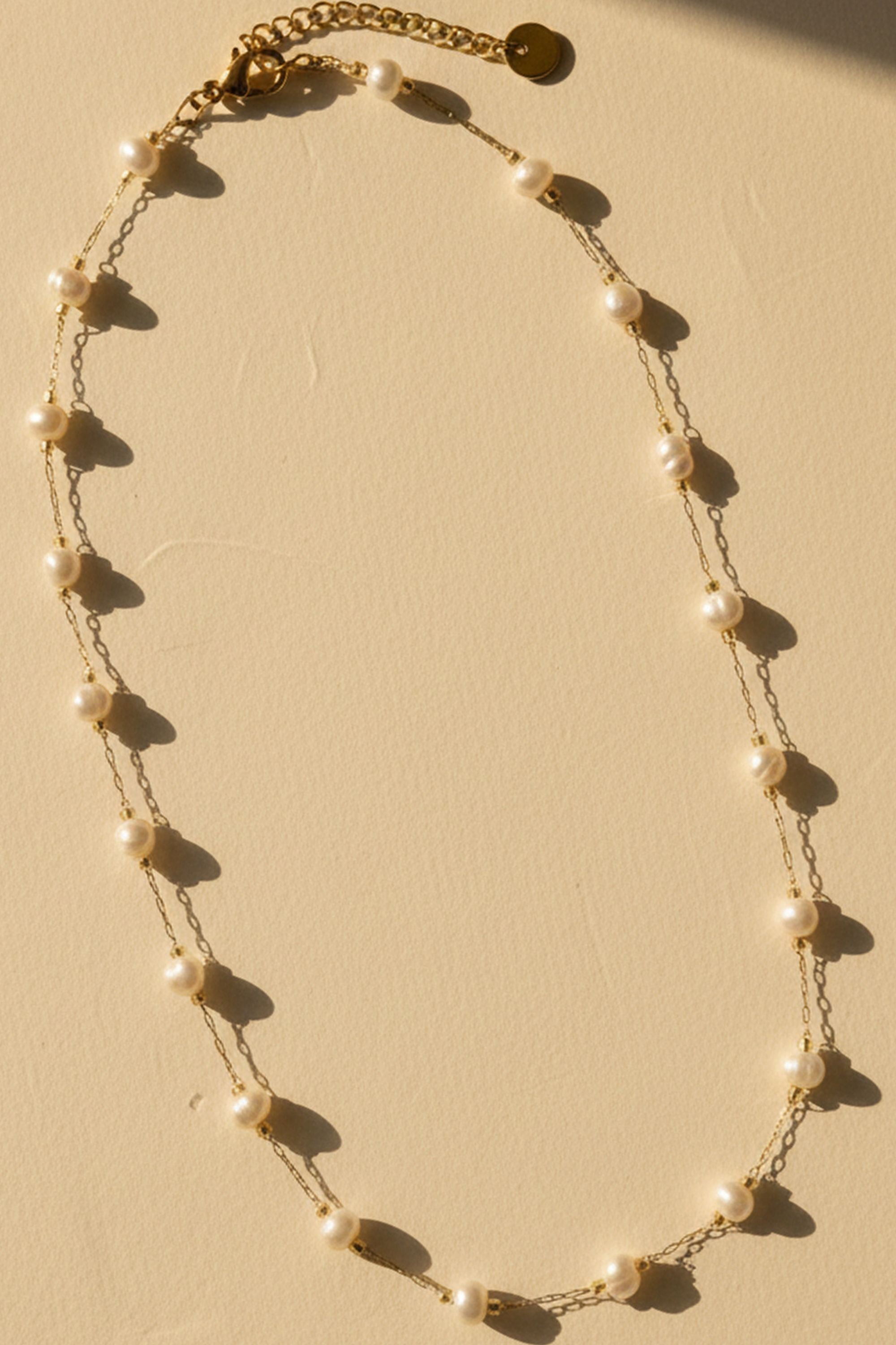 Elegant and timeless, this delicate pearl chain necklace adds a soft, feminine touch to any look. Designed with small irregular freshwater-style pearls spaced along a fine chain, it brings subtle shine and everyday sophistication. Perfect worn alone for a minimal chic vibe or layered with your favorite pieces for a modern, textured look. Available in gold or silver to match every style.