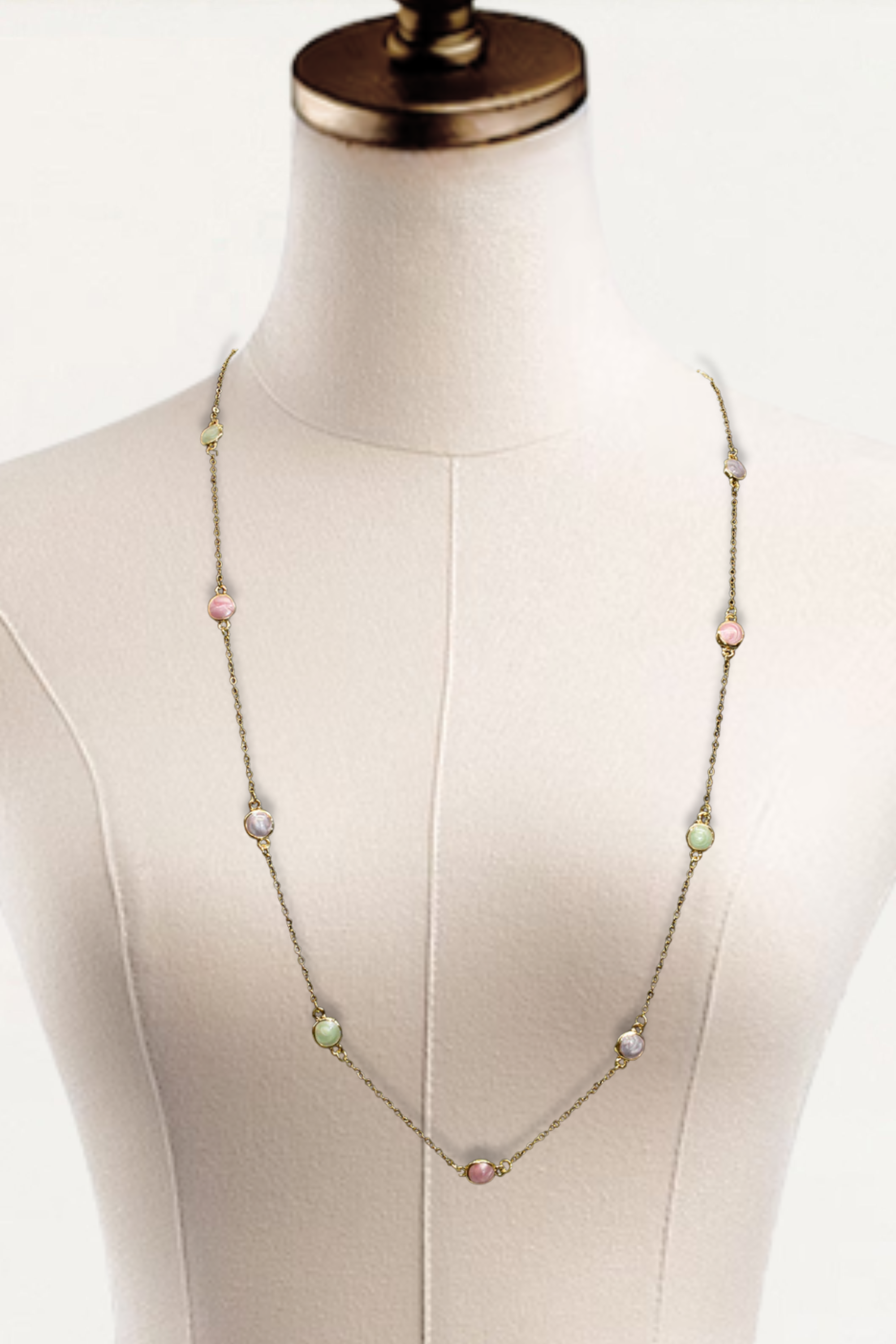 Delicate gold chain necklace accented with soft pastel stones. Light, elegant, and perfect for layering or wearing on its own.