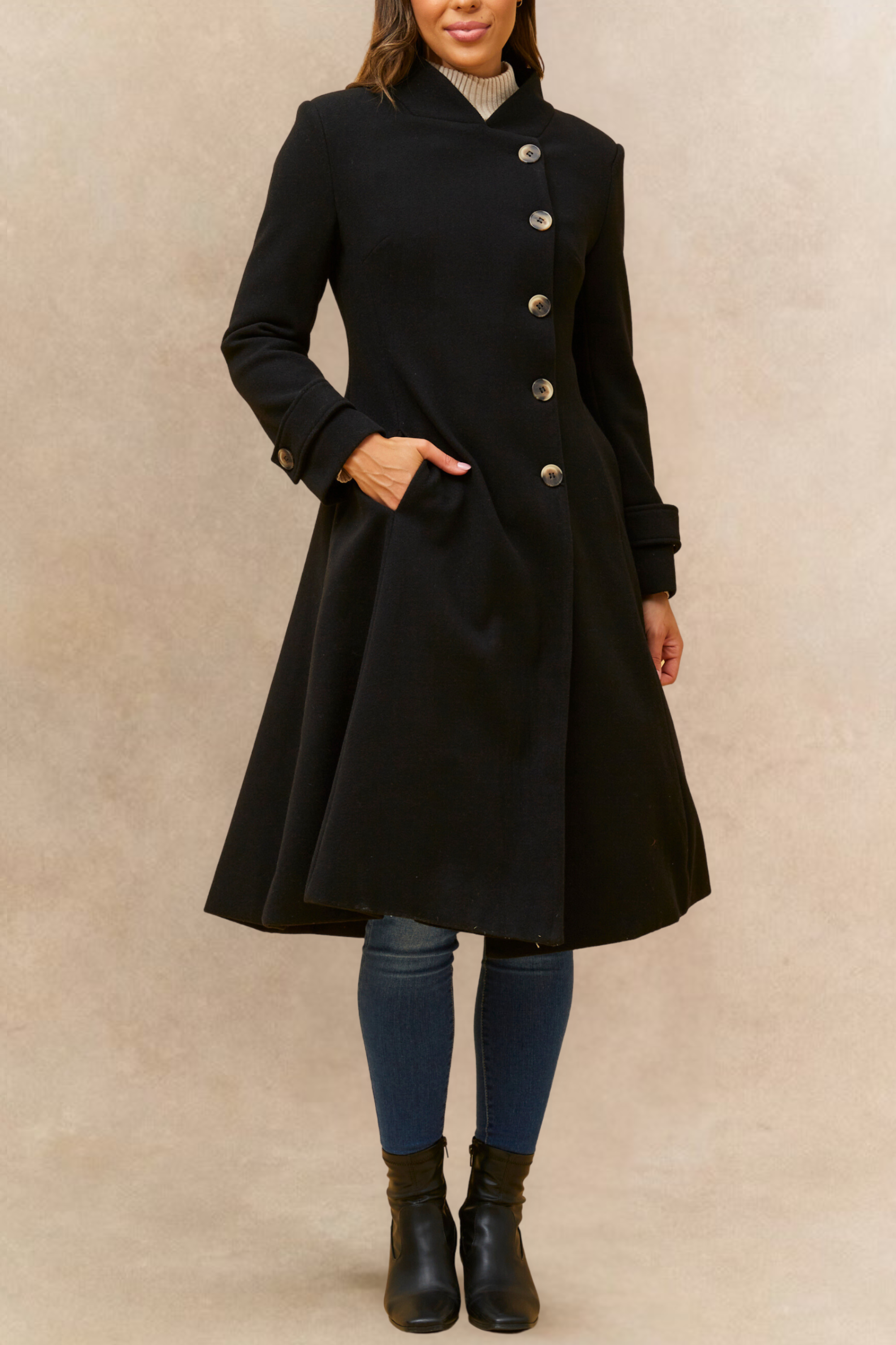 Elevate your winter wardrobe with the Harper Coat, a flawless blend of quality craftsmanship and sophisticated style. Crafted from premium fabric, this coat offers both comfort and a distinctive wow factor, highlighted by its unique side button closure. Its tailored fit and flared design beautifully accentuate your curves, creating a comfortably flattering silhouette for all body types. Finished with an officer collar, the Harper Coat is a versatile piece that pairs effortlessly with elegant dresses or casual jeans, making it a best seller.