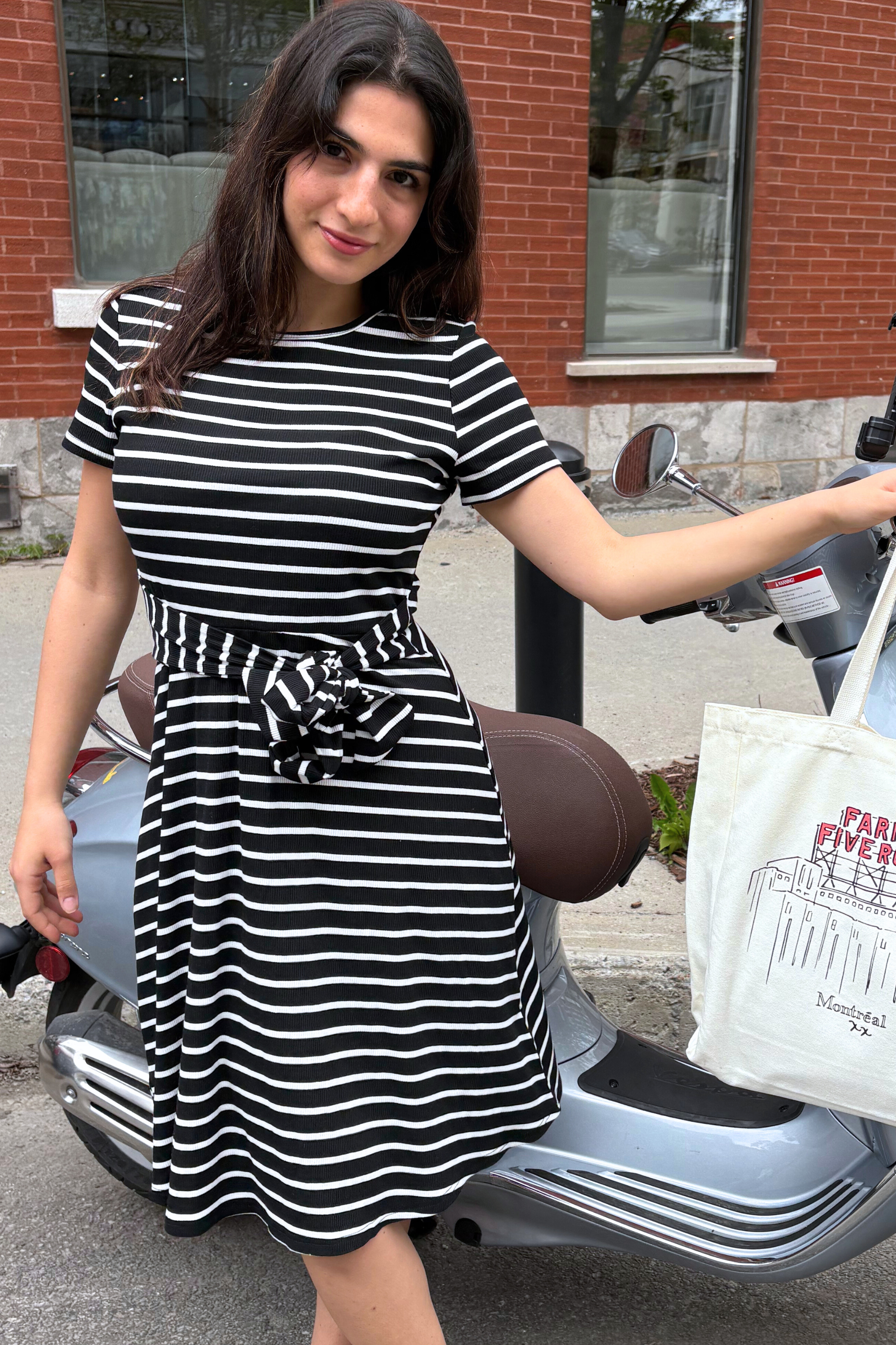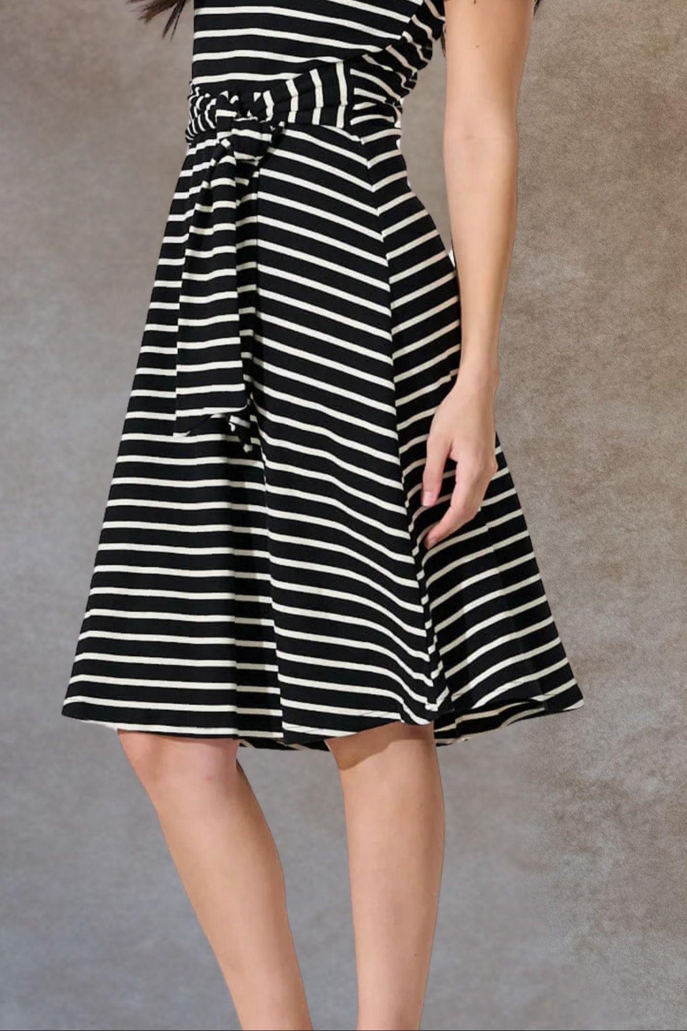 Easy to wear, easy to love — the Jodie Short Knit Dress brings everyday comfort with a flattering twist. Designed in a soft cotton-spandex knit, this striped dress features a round neckline, short sleeves, and a self waist tie to define your shape. The A-line skirt moves with ease, making it perfect for everything from errands to casual outings.