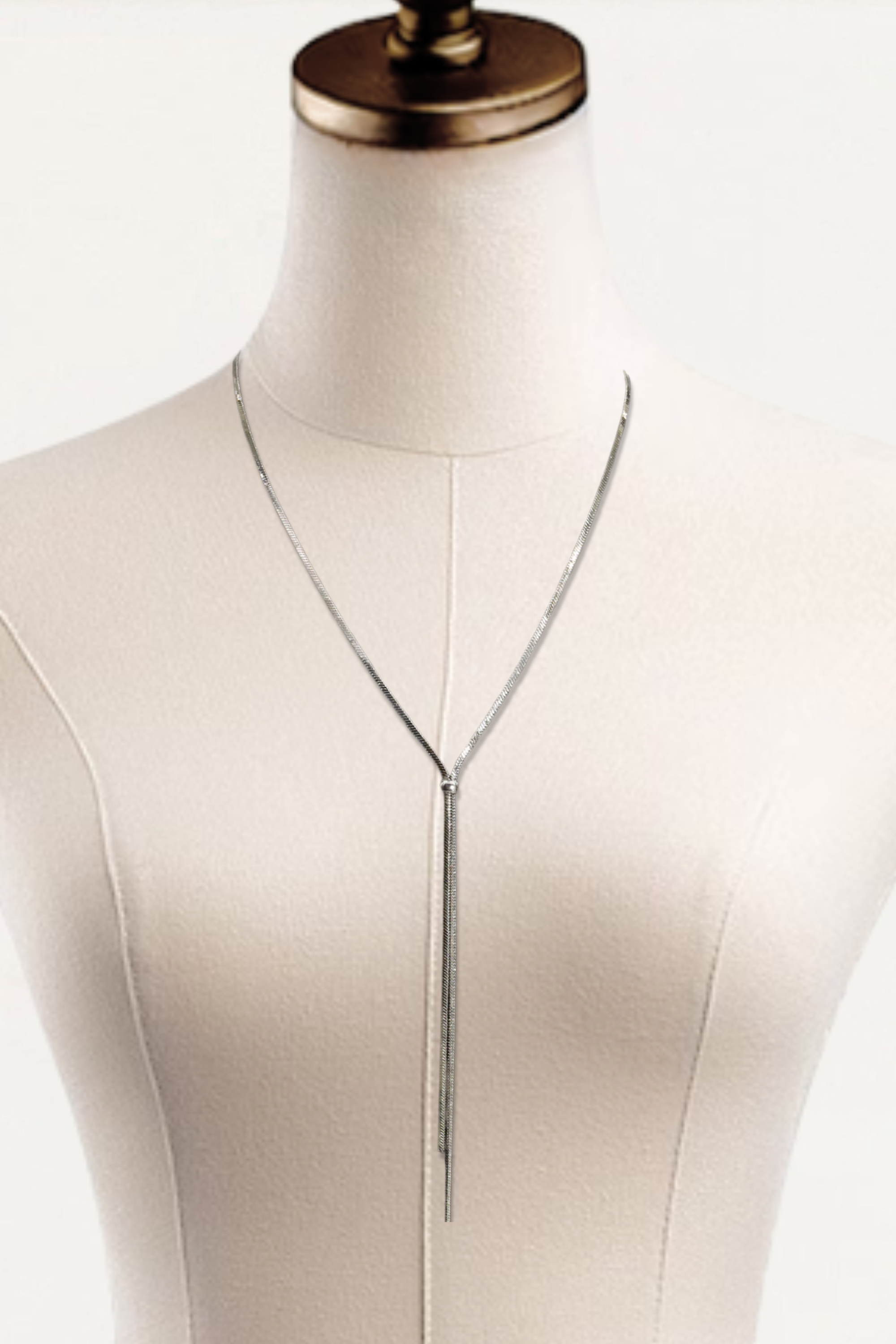 A modern silver-tone lariat necklace with a sleek herringbone snake chain. Easy to adjust for the perfect fit, perfect for layering or wearing solo.