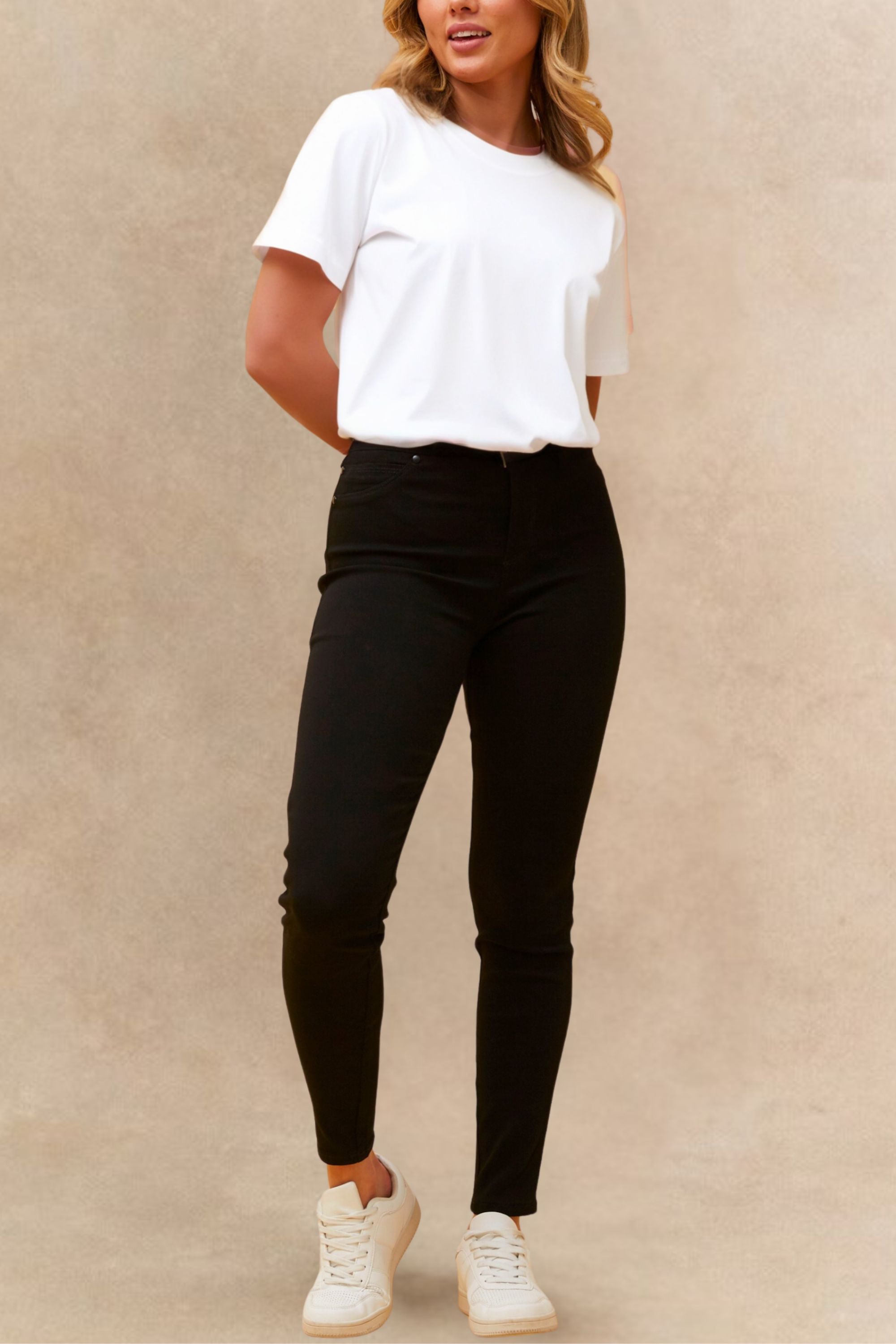 A must-have basic you'll wear on repeat. These full-length black pants feature a flattering regular fit with a clean, tailored look—perfect for work, weekends, and everything in between. Designed with an elasticated waistband for all-day comfort and finished with subtle hardware at the mock side pockets for a modern touch. Easy to dress up or down, these versatile pants pair effortlessly with tees, blouses, or knits year-round.