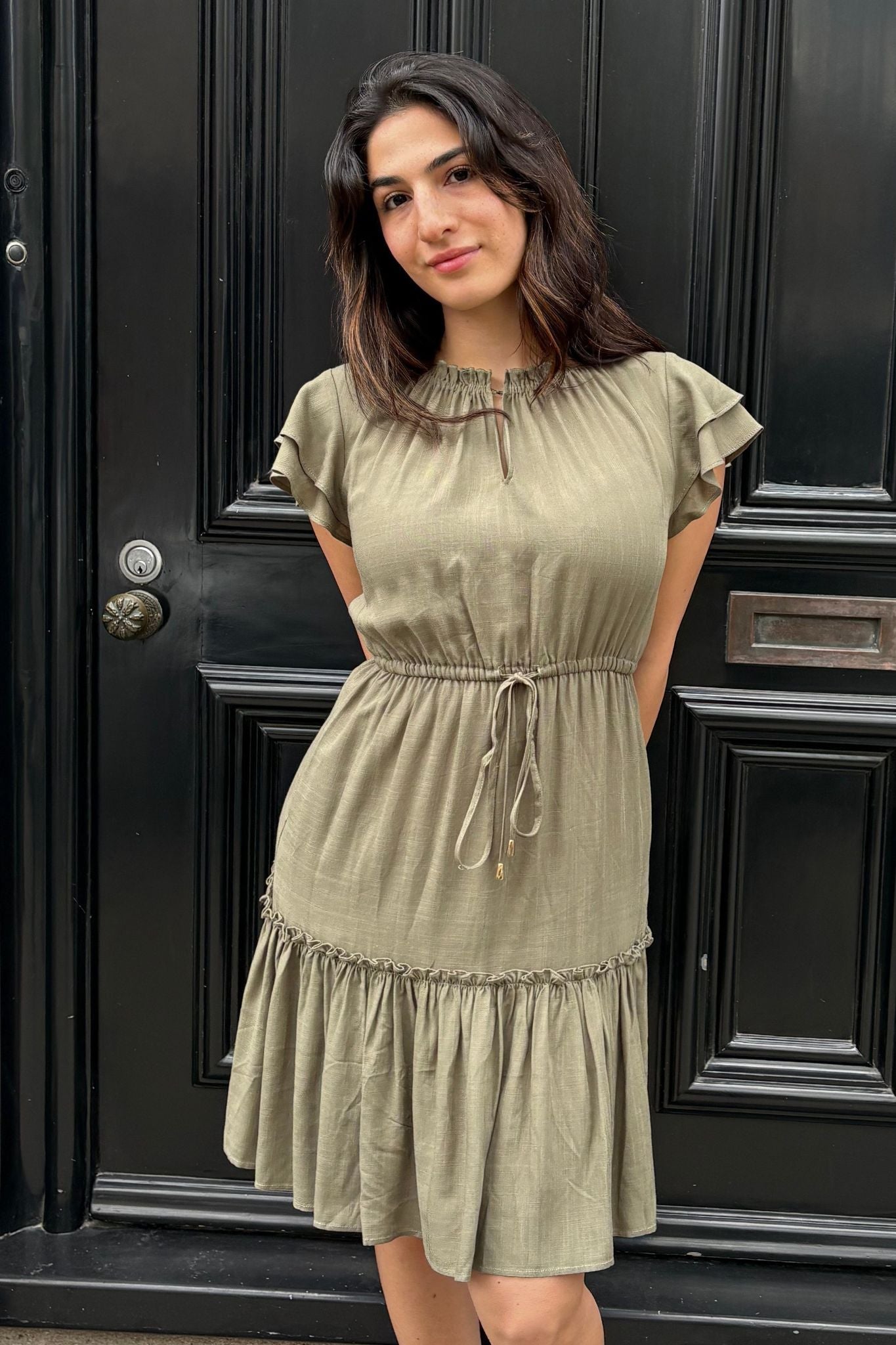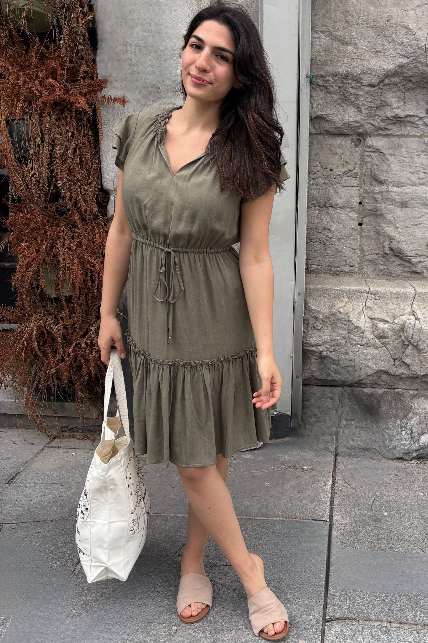 A breezy short dress with soft ruffle sleeves, a flattering drawstring waist, and a tiered skirt for a playful finish. The V-neckline features a hidden tie you can fasten for added coverage or leave open for a relaxed look. Perfect for warm days, city strolls, or weekend brunches. The gathered hem adds movement and charm, making it an effortless go-to. It also includes side pockets to carry your essentials.