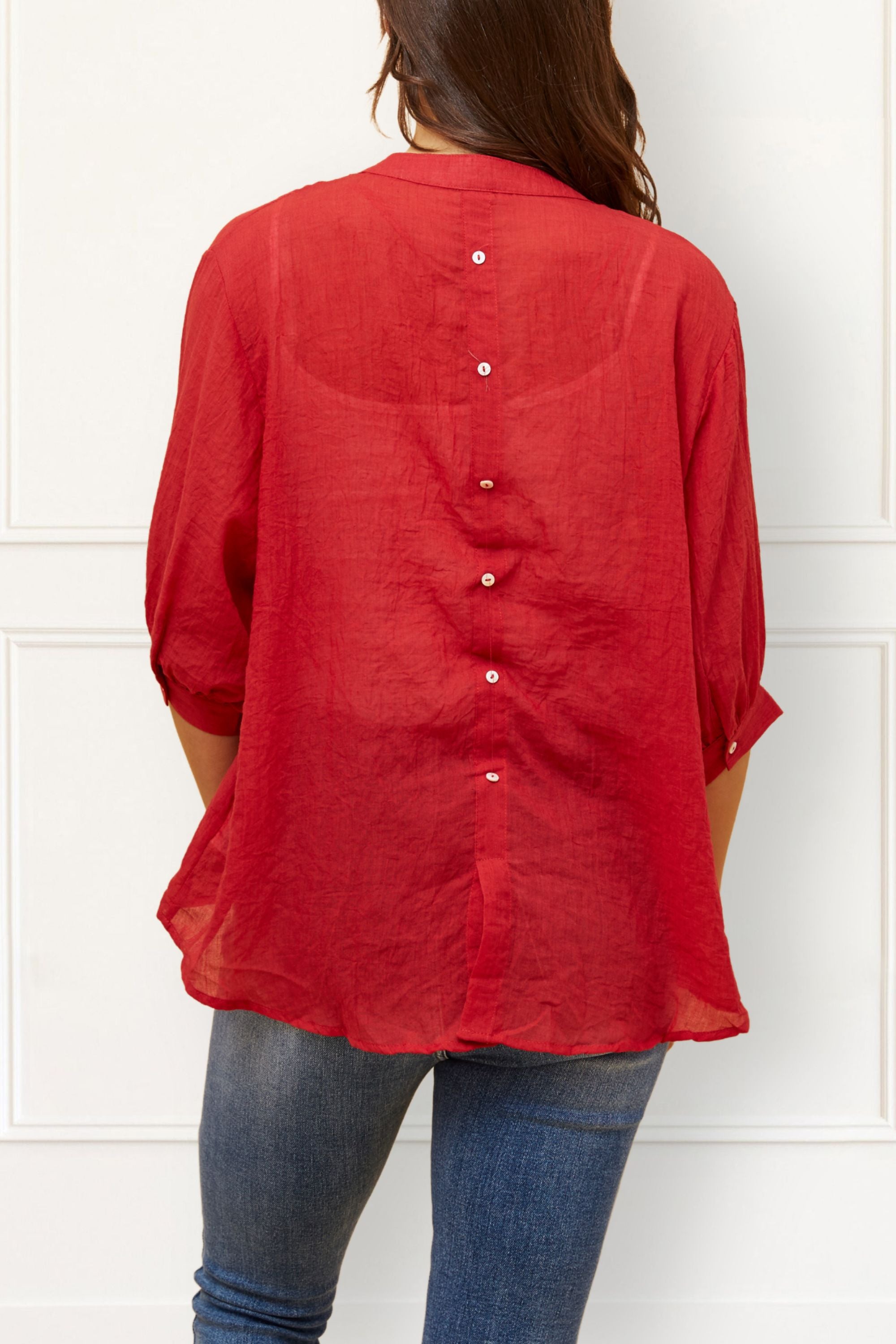 Meet the Roxanne Oversized Button-Down Shirt — a modern essential designed for effortless everyday style. Crafted from breathable, semi-sheer cotton blend fabric, this relaxed-fit blouse features a distinctive button-down design on both the front and back, adding a unique twist to a classic silhouette. Its airy feel and rolled ¾ sleeves make it the perfect layering piece for warm weather or transitional seasons. A must-have piece for women who value comfort with contemporary flair. Ideal to wear open over a tank or buttoned up for a polished casual look