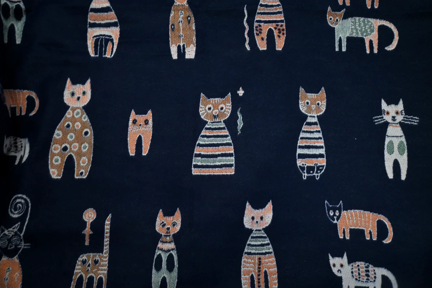 Stay cute and cozy in this vintage inspired scarf with cat motif with elegant solid border